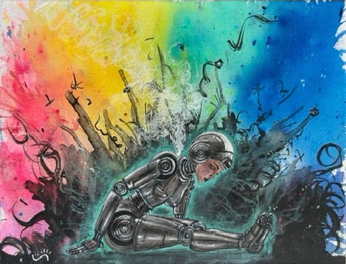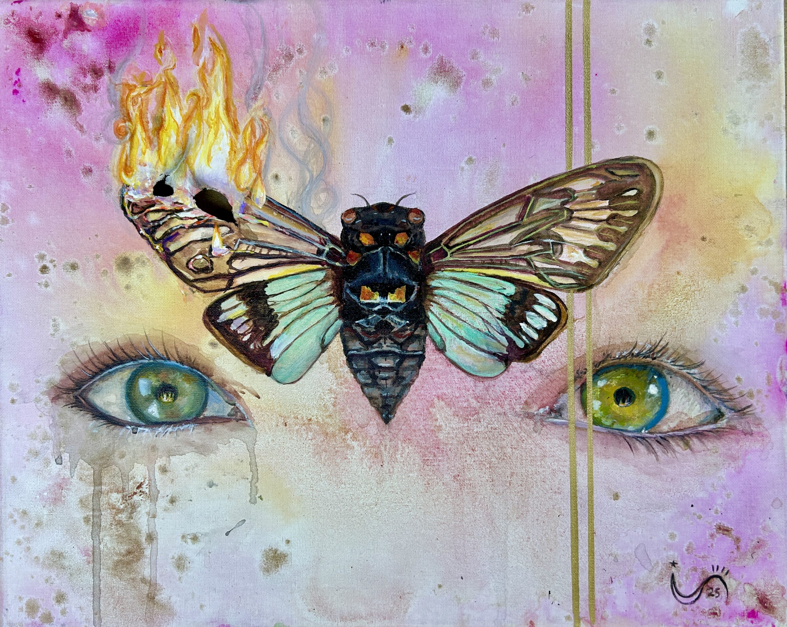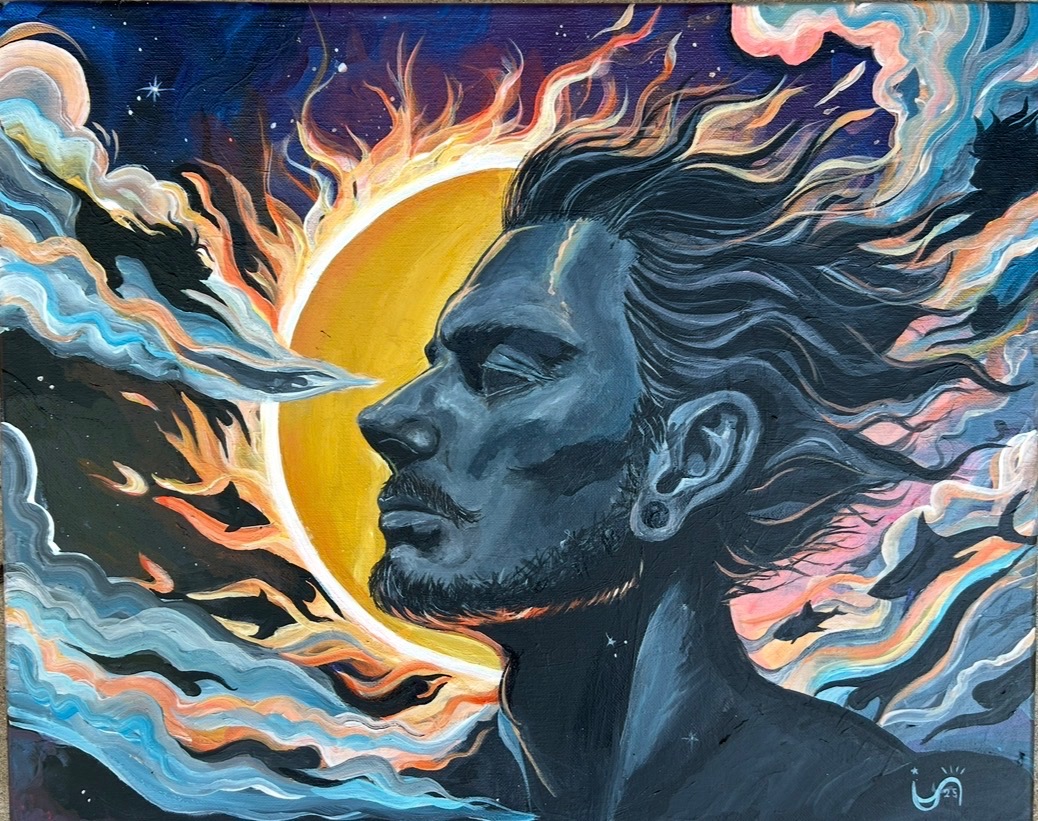On canvas, that same energy shifts into something more reflective. I paint in layers, pulling from nature, symbolism, and emotion—exploring themes like transformation, contrast, and the unexpected beauty that can exist alongside struggle. I want my work to captivate at first glance, then invite people to pause, reflect, and find their own meaning within it.
